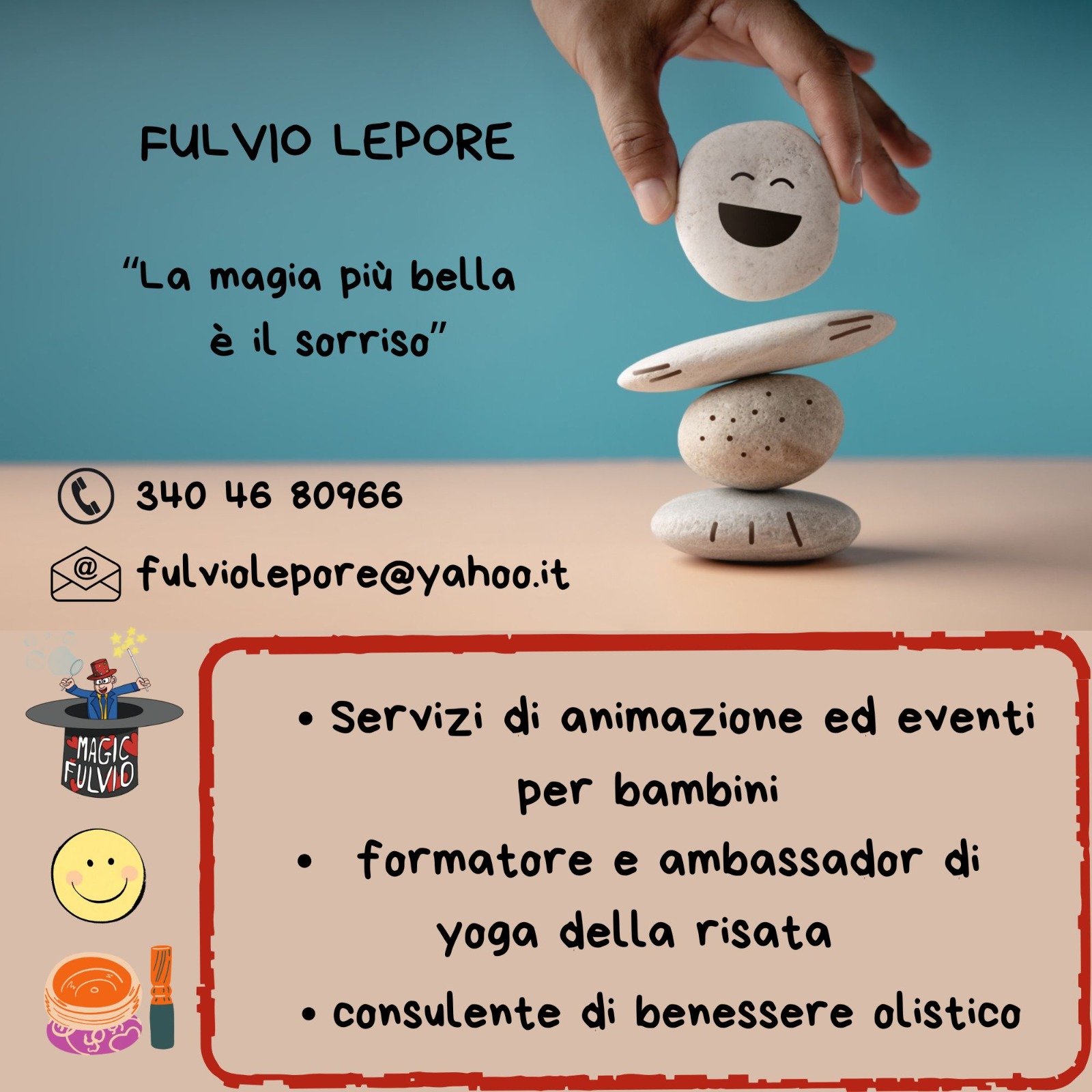 Fulvio Lepore organizza percorsi di yoga della risata come pratica di benessere, propone massaggi armonici integrali con campane tibetane e diapason, e realizza spettacoli creativi di bolle di sapone e magia dedicati ai bambini e alle famiglie.