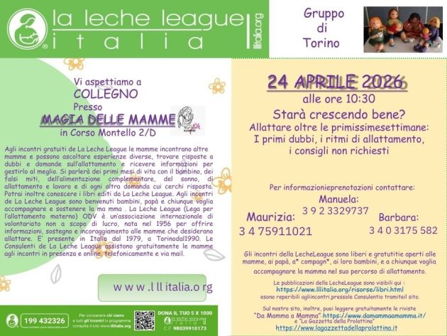 Agli incontri gratuiti de La Leche League le mamme incontrano altre mamme e possono ascoltare esperienze diverse, trovare risposte a dubbi e domande sull’allattamento e ricevere informazioni per gestirlo al meglio. Si parlerà dei primi mesi di vita con il bambino, dei falsi miti, dell’alimentazione complementare, del sonno, di allattamento e lavoro e di ogni altra domanda cui cerchi risposta. Potrai inoltre conoscere i libri editi da La Leche League. Agli incontri de La Leche League sono benvenuti i bambini, i papà e chiunque voglia accompagnare e sostenere la mamma.
