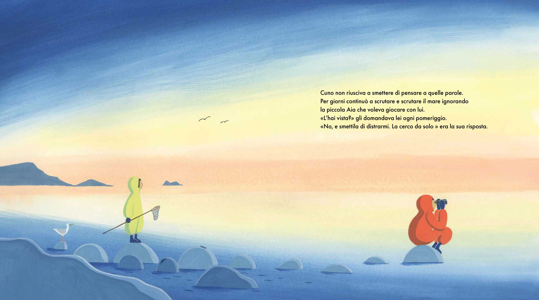 Cuno continuava a pensare al racconto del papà. A quella balena misteriosa. “Per giorni continuò a scrutare il mare ignorando la piccola Aia che voleva giocare con lui”.