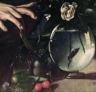 Ma guardando il Ragazzo oggi esposto a Torino, conosciamo il Caravaggio giovane. Quello che si autodefiniva un “valent’uomo”, così ambizioso da dipingere nello stesso volto: sorpresa, sgomento e dolore; nello stesso quadro: un animale, un uomo, fiori e frutta e così incredibilmente bravo da aggiungere sulla brocca d’acqua il sorprendente riflesso di una porta aperta sulla luce.