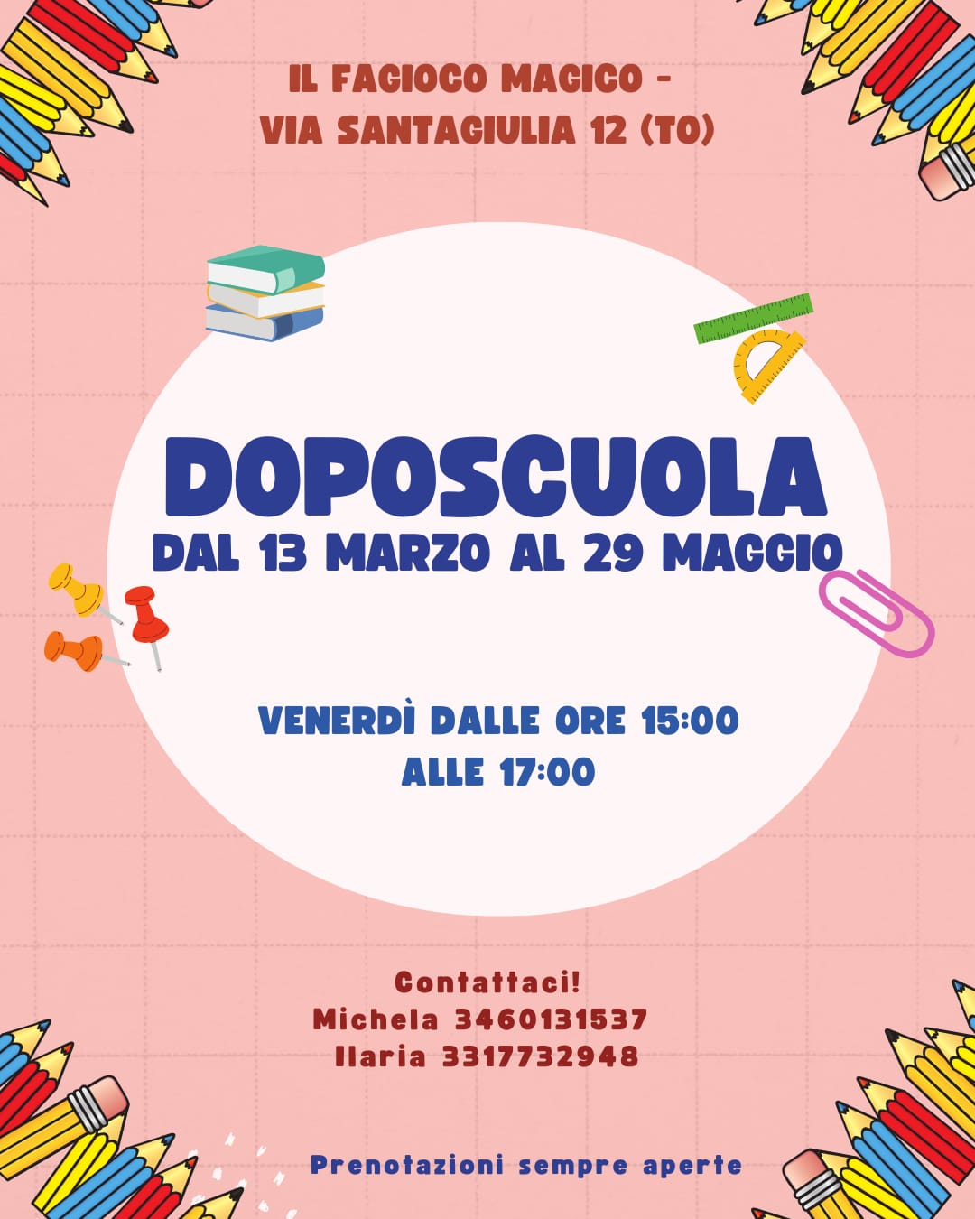 Supporto allo studio del venerdì: metodo, concentrazione e fiducia. Un aiuto concreto per affrontare i compiti con più serenità e organizzazione. Dal 13 marzo al 29 maggio 2026, ogni venerdì dalle 15:00 alle 17:00, parte un percorso di supporto allo…