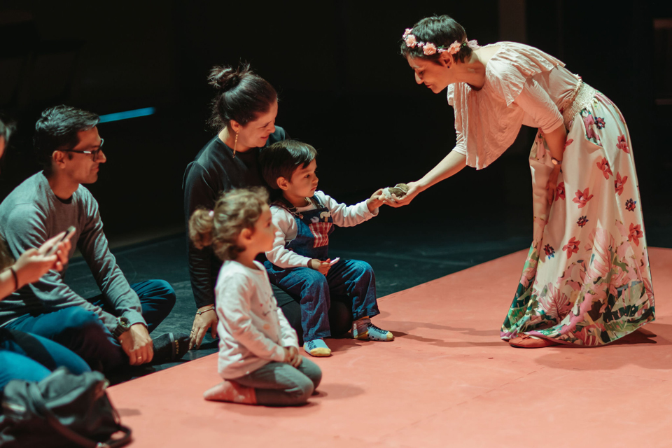 L’attrice alterna il racconto di leggende e miti di creazione...